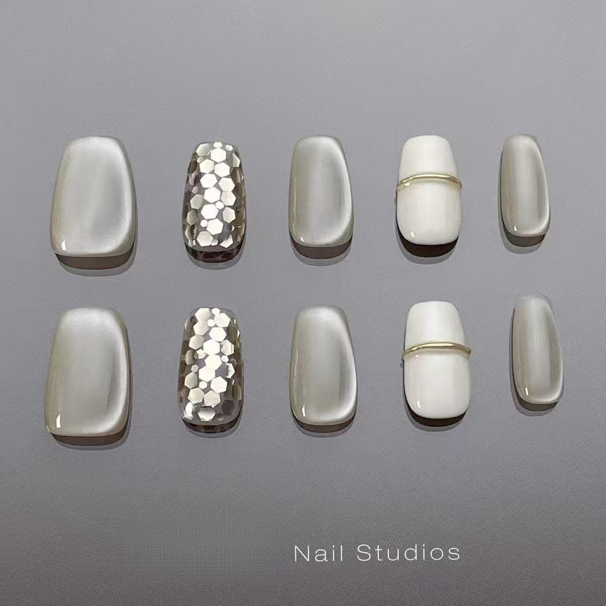 Glitter Cat Eye Milky White 3D Line Nail Art Press On Nails